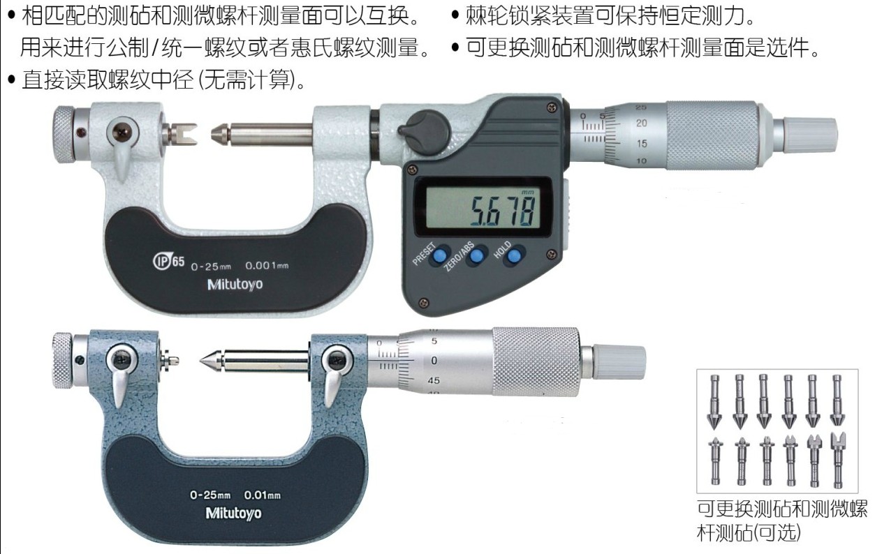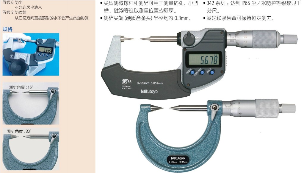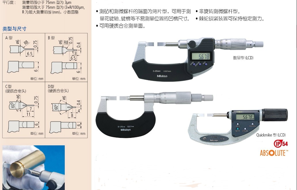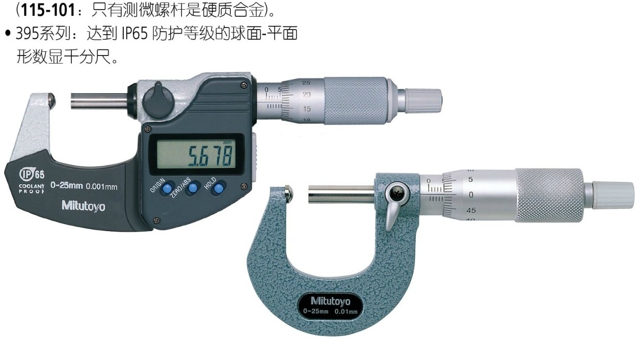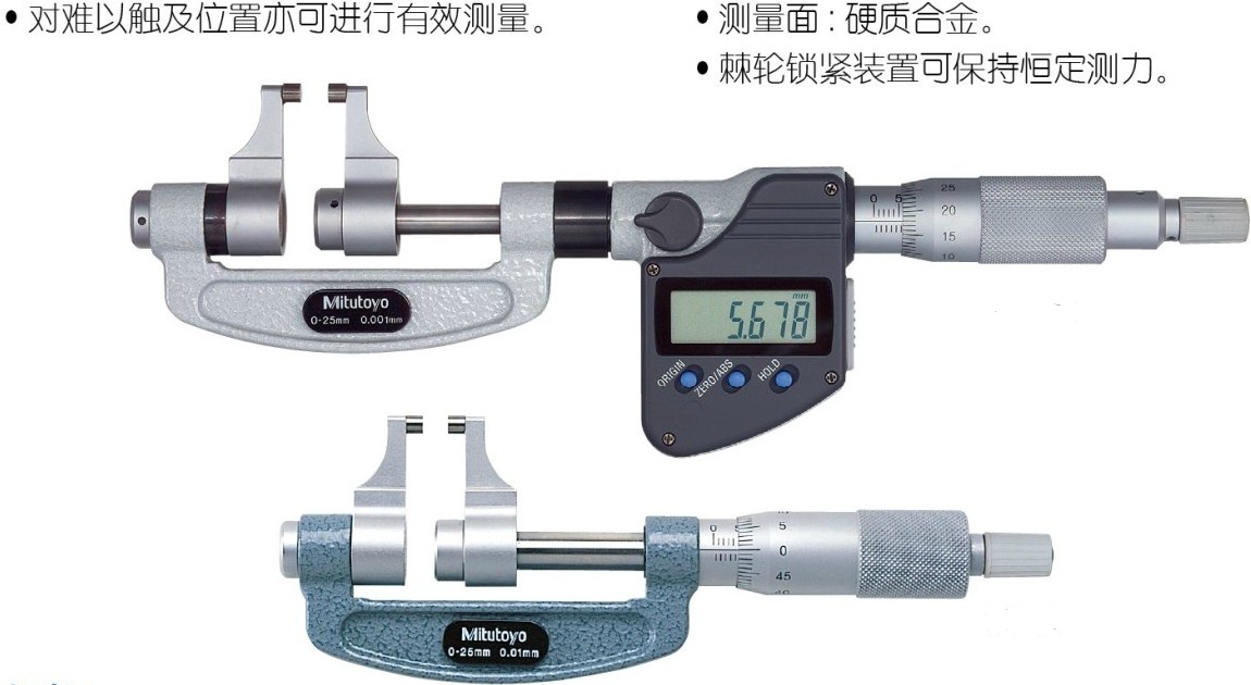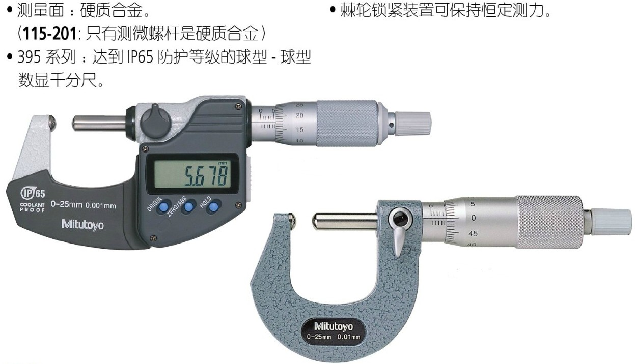 · 卡尺 · 千分尺、分厘卡、微分头、卡规 · 百分表、千分表、杠杆表、厚度 · 内径表、缸径规 · 高度尺、深度尺 · 磁性座、台架 · 基准器具、环规、量块 · 测量数据管理 · 其它量具 |